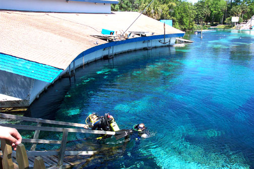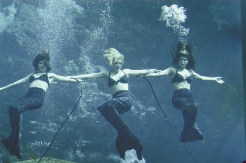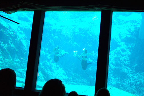 With their bulky tails, the mermaids do not move with the grace of Ariel. Mind you it is not easy to maintain neutral buoyancy, fight the currents, smile at all times and locate air hoses while you lyp-sync to muffled music. All with the blurred vision of only a few feet.