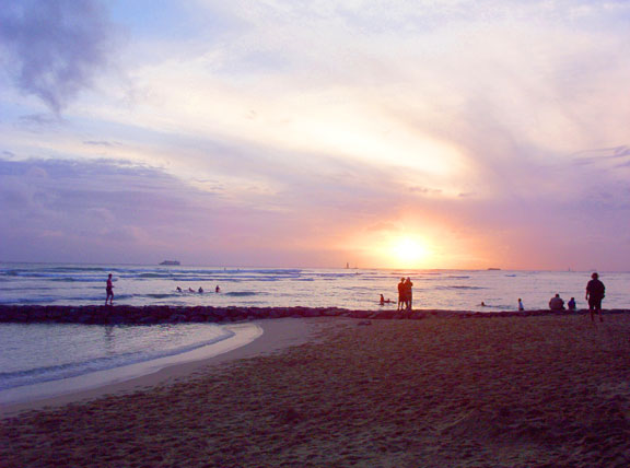 beach on our first night in Honolulu. Surfers can still be seen trying to